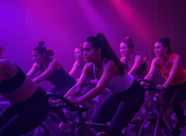 Cours de vélo en salle, rythmé par la musique, axé sur l’endurance et la dépense énergétique.