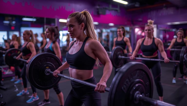 Cours de renforcement avec barre et charges modulables, sur musique rythmée.
